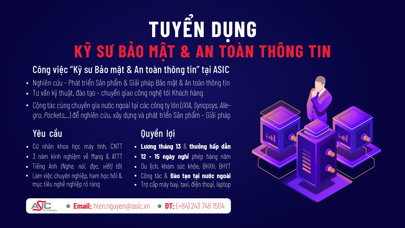ASIC Technologies., jSC là Công ty hoạt động trong lĩnh vực Đo lường Điện – Điện tử, An toàn thông tin cho mạng và ứng dụng. Hiện nay, chúng tôi đang cần tuyển dụng kỹ sư bảo mật với các tiêu chí như sau: