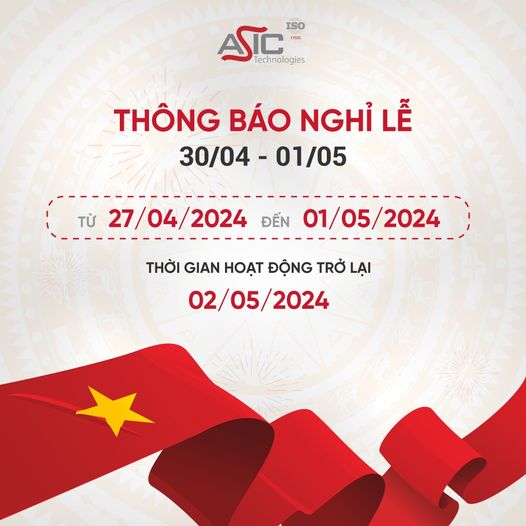 ASIC Technologies xin thông báo tới Quý khách hàng lịch nghỉ lễ 30/4 và 1/5 như sau: