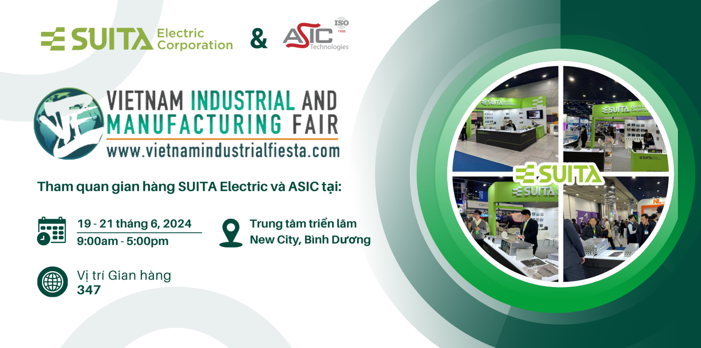 Tham dự VIMF 2024 là cơ hội tuyệt vời để Quý khách gặp gỡ và trao đổi với chúng tôi về nhu cầu kiểm tra và Đo lường Điện – Điện tử. Kỹ sư của ASIC và SUITA Electric sẽ có mặt tại triển lãm để chia sẻ về sản phẩm và giải pháp của SUITA ứng dụng trong lĩnh vực ô tô, pin, năng lượng mặt trời, lưu trữ năng lượng, bán dẫn, sản xuất và nghiên cứu phát triển.