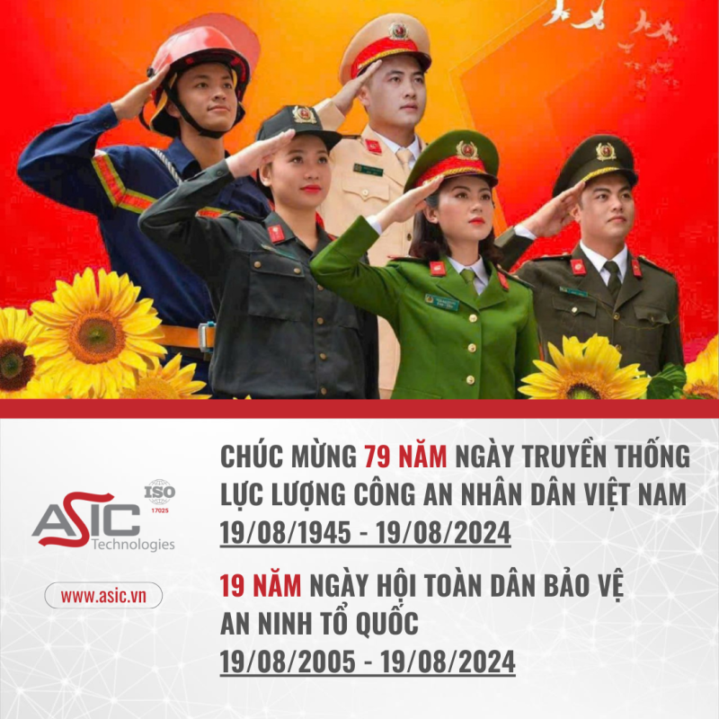 Nhân kỷ niệm 79 năm ngày Truyền thống Lực lượng Công an Nhân dân, ASIC Technologies xin được kính chúc các thế hệ cán bộ, chiến sĩ đã và đang phục vụ, công hiến trong ngành Công an thật nhiều sức khỏe, bản lĩnh, trí tuệ, mưu trí, dũng cảm hoàn thành xuất sắc mọi nhiệm vụ được giao. Giữ vững sự nghiệp cách mạng vẻ vang của dân tộc, sự bình yên, hạnh phúc và thịnh vượng của nhân dân ta.