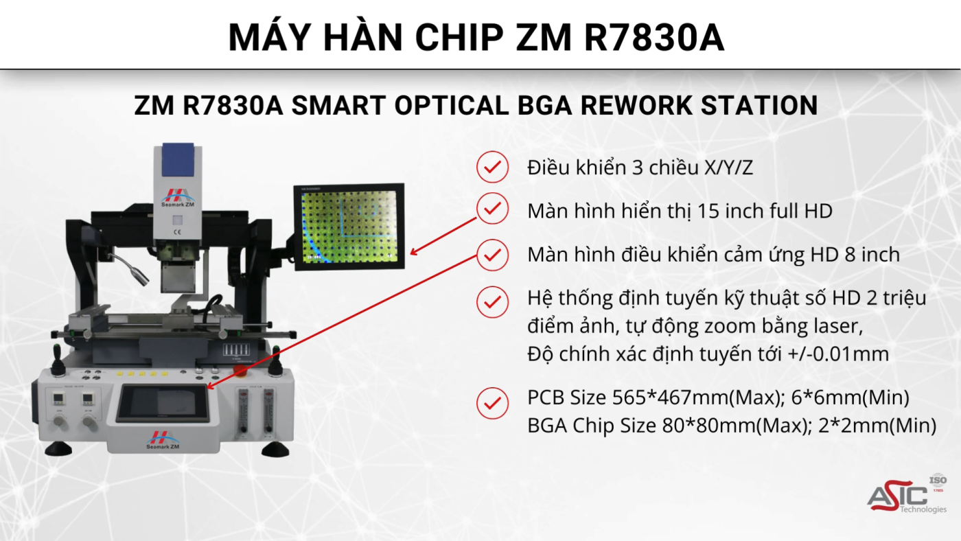 Máy ZM R7830A Smart Optical BGA Rework Station là thiết bị hiện đại được thiết kế để đáp ứng nhu cầu sửa chữa và hàn lại các mạch tích hợp BGA (Ball Grid Array). Đây là sản phẩm được trang bị công nghệ tiên tiến và các tính năng thông minh, mang lại hiệu quả cao và độ chính xác trong quá trình làm việc.