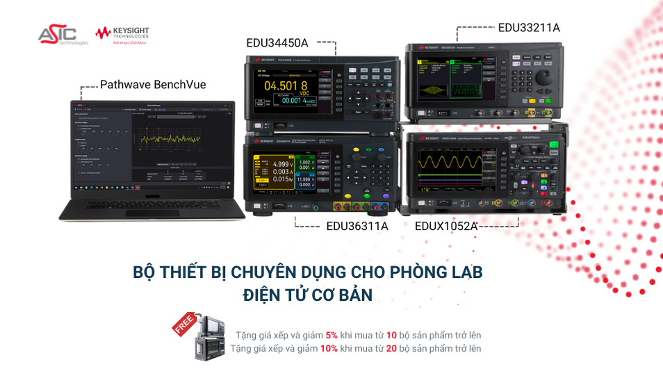 ASIC Technologies xin gửi tới Quý Khách hàng Chương trình khuyến mãi hấp dẫn dành cho Bộ thiết bị chuyên dụng cho phòng Lab Điện tử cơ bản của Keysight – Gồm 4 thiết bị và phần mềm Pathwave BenchVue – với giá khởi điểm chỉ từ 69 triệu VND