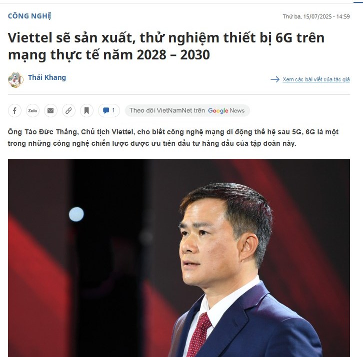 Theo thông tin từ Vietnamnet, Tập đoàn Viettel đã đặt mục tiêu sản xuất và thử nghiệm thiết bị mạng 6G ngay trên hạ tầng thực tế trong giai đoạn 2028 – 2030. Đây được xem là bước tiến quan trọng, thể hiện chiến lược dài hạn và năng lực làm chủ công nghệ lõi của Việt Nam trong cuộc đua toàn cầu về công nghệ 6G.
